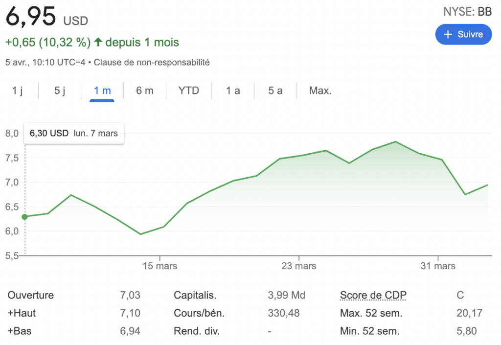 Début d’avril 2023, le cours Blackberry est situé en dessous de 7 USD ce qui est un prix bas pour cette action.