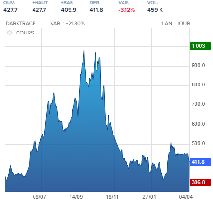 Lors de leur IPO, les actions Darktrace étaient vendues à peine au-dessus de 300 dollars. Aujourd’hui, leur cours est situé à environ 416$.