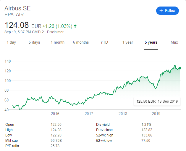 Les nouveaux investisseurs peuvent se réjouir, l’action Airbus est encore accessible à des prix relativement bas. Selon les experts, la valeur intrinsèque de l’action est actuellement de 230.2 Euros. Pourtant, en ce moment, vous pouvez vous la procurer à seulement 123 Euros, sur le marché boursier. En d’autres termes, vous allez pouvoir bénéficier de la forte croissance de valeur qui va suivre. Cependant, pour les plus sceptiques, vous avez aussi la possibilité d’attendre encore un peu, avant de vous décider, puisqu’il est probable qu’une autre opportunité se présente dans le futur. Il ne faut pas oublier que l’action Airbus est, en temps normal, extrêmement volatile. Cela veut dire que ses plus hauts et ses plus bas se distinguent par des pics intéressants, et cela permet de se placer sur son cours avec beaucoup plus de facilité.