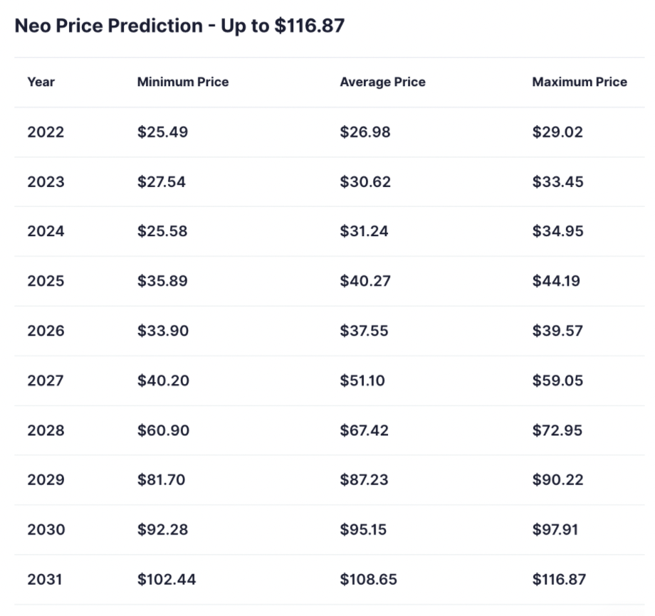 Selon les prévisions de la plateforme Digital Coin Price, NEO devrait connaître une belle évolution pour les prochaines années. Cependant, cela sera plutôt timide pour 2024 et les 2-3 ans qui suivent. Le cours aura tendance à stagner et ne pas connaître des pics de prix impressionnants comme nous avons pu le voir avec le cours Bitcoin par exemple.