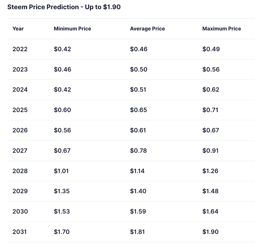 Le cours de Steem crypto semble connaître une augmentation intéressante depuis le début de l’année, mais les experts ne prévoient pas de gros changements pour les mois et années à venir. Cela devrait davantage se déterminer vers l’année 2024-2025.