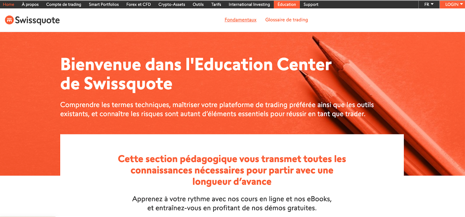 Swissquote met à disposition quelques outils intéressants pour gagner en compétences et obtenir les fondamentaux du trading en ligne. Cependant, le broker manque de contenu pédagogique. Un point non négligeable qui ne permet pas aux traders plus expérimentés de gagner en compétences et de peaufiner leur stratégie de trading.