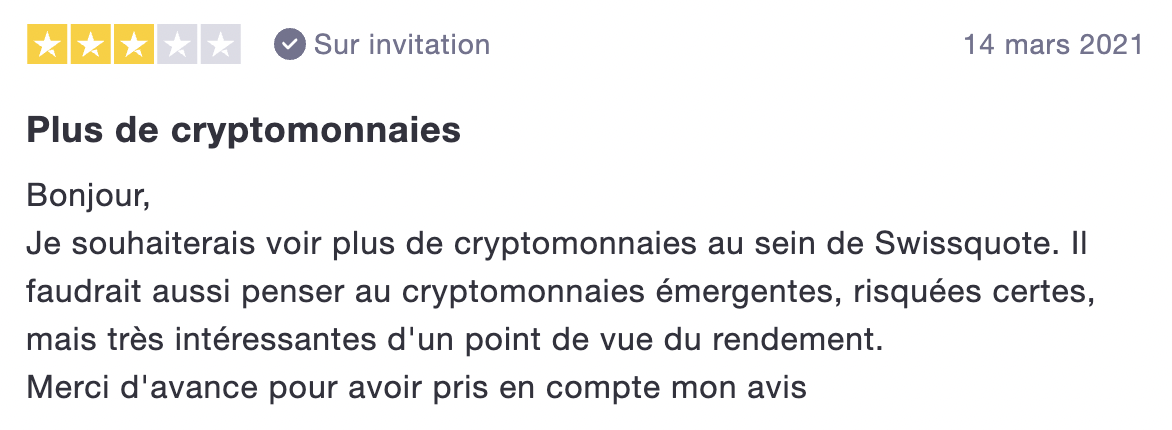 En effet, ce premier témoignage met en évidence un point non négligeable, le manque de crypto-monnaies. Actuellement, le broker Swissquote n’en propose que 12, toutes principalement des devises majeures. Un point qui vient clairement frustrer les amateurs de crypto-monnaies.