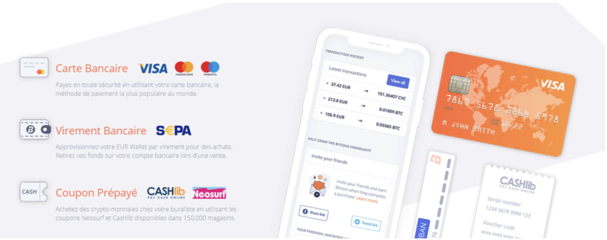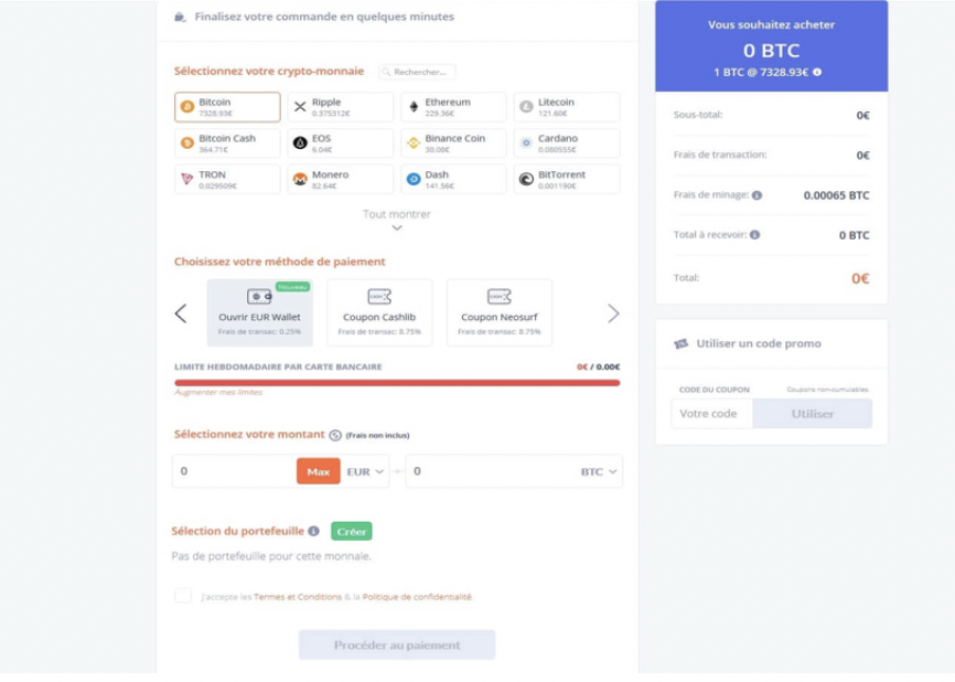 - Enfin, sur la plateforme Bitit, vous pouvez acheter les crypto-monnaies à l’aide des coupons prépayés. Toutefois, les frais relatifs à chaque transaction sont fixés à 8,75% du montant déposé.