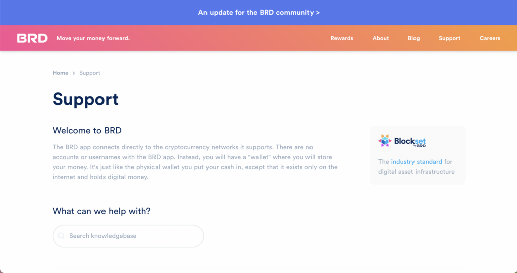 Bread Wallet ne possède pas réellement un service client. Cependant, vous trouverez une catégorie sur le site officiel entièrement dédié au support que peut apporter l’équipe et la communauté. Une page FAQ complète et très bien détaillée saura répondre à toutes vos questions les plus fréquemment posées.