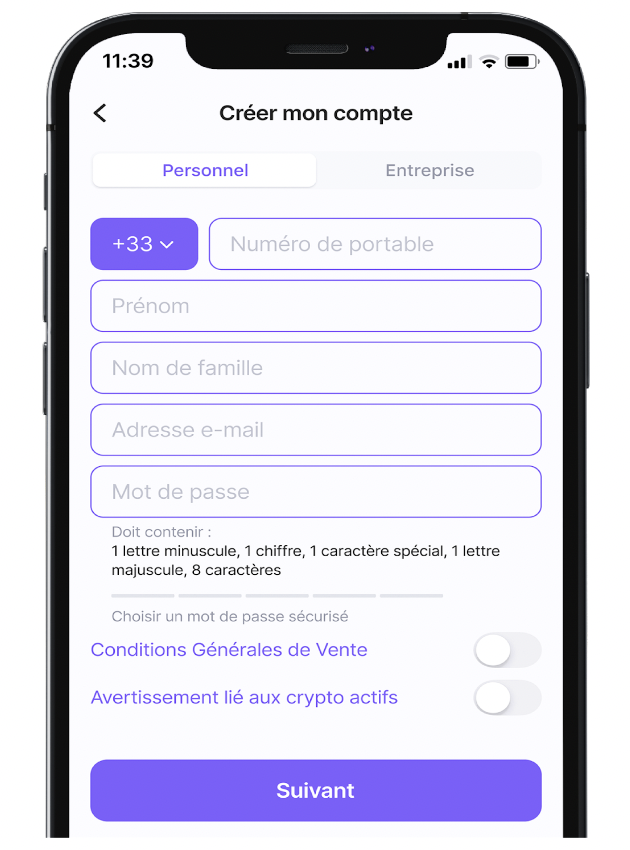 - À la première ouverture, il vous sera demandé d’indiquer votre numéro de téléphone, nom, prénom, email et mot de passe.