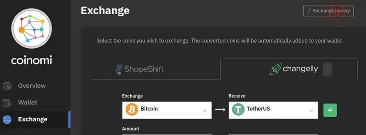 Bien que Coinomi ne soit pas véritablement une plateforme d’échange, elle permet néanmoins d’échanger des actifs grâce à son partenariat avec d’autres échangeurs. Le processus est simple. Il faut juste ouvrir la barre latérale gauche et choisir l’option « échanger ».