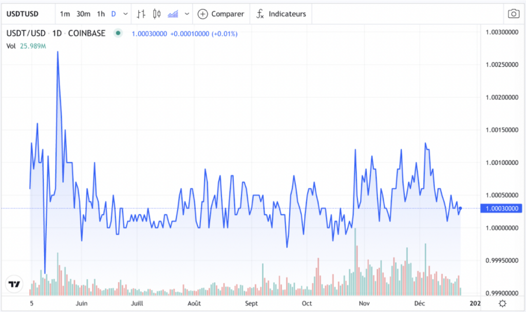Le Tether suit l’évolution du dollar américain et s’il y a une fluctuation cela n’excède pas le centime de dollar américain.