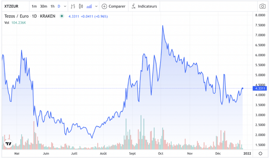 - Année 2021 : globalement, Tezos cours a connu une année plutôt positive. Bien qu’il y ait eu une bulle spéculative entre juin et août, le cours n’a cessé de grimper tout le reste de l’année. Actuellement, le cours Tezos crypto est à 4,33 €.