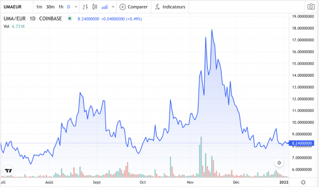 - Année 2021 : si l’année a très bien commencé avec un pic de prix de 28,96 € en février 2021, Uma crypto a rapidement subi sa volatilité pour redescendre en dessous de la barre des 10 € en juillet.
