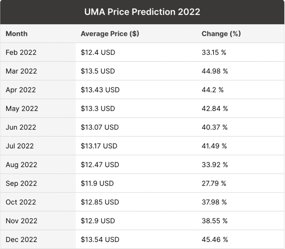 Selon la plateforme Digital Coin Price, l’année 2022 devrait connaître une belle croissance du côté du cours Uma avec tout de même une volatilité beaucoup plus douce que pour les crypto-monnaies classiques.