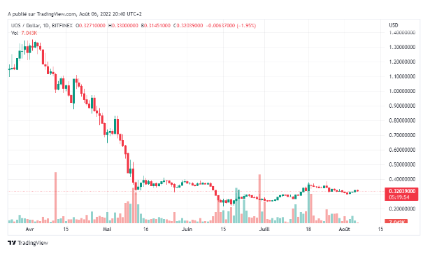 Depuis lors, son cours a baissé par rapport au marché. Après l'effondrement de LUNA et de son stablecoin UST, la crypto UOS s'échangeait à environ 0,30 €. Il s'agit donc d'un jeton “bon marché” (contrairement à l'ETH et au BTC, qui valent des milliers d'euros).