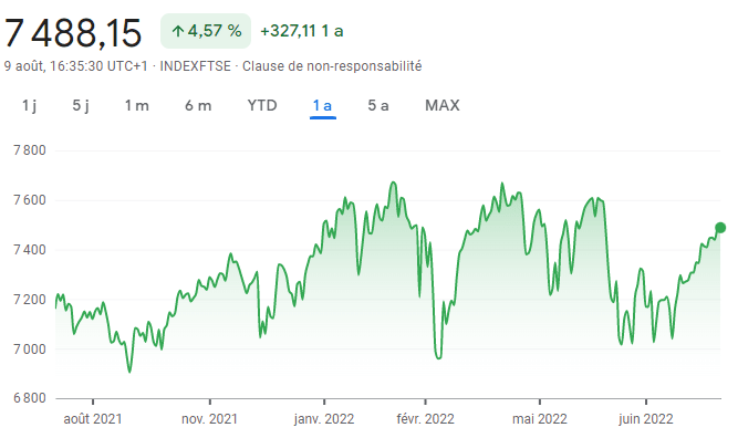 L’indice boursier FTSE 100 dispose d’un cours donné sous la forme de points qui s’élève actuellement à 7488,15 points, le 10 août 2023.