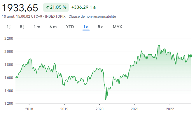 L’indice boursier Topix dispose d’un cours donné sous la forme de points. Il s’élève actuellement à 1933,65 points.