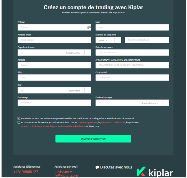 L’ouverture d’un compte de trading pour trader sur Kiplar est assez simple et gratuite. Il suffit de se rendre sur la page d’accueil du site et cliquer sur “S’inscrire”, puis remplir le formulaire d’inscription et valider sur “Envoyer l’inscription”.