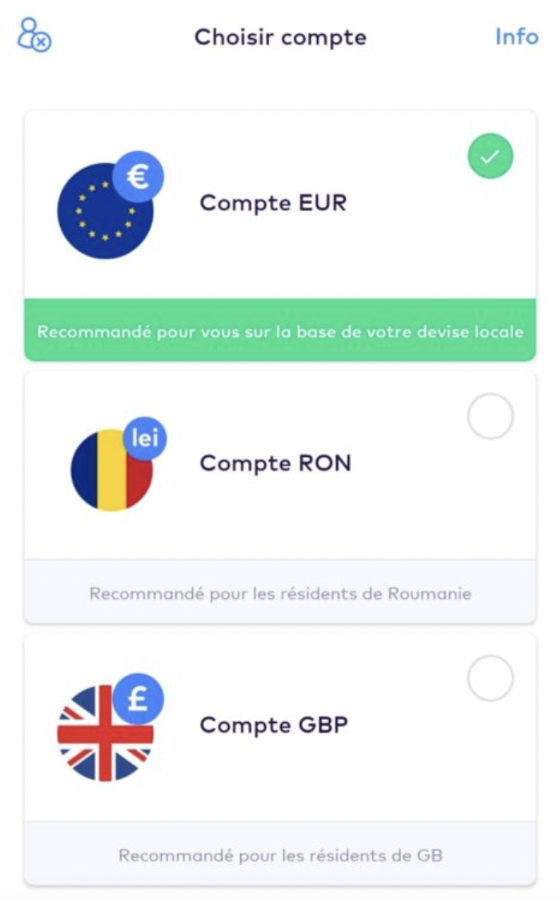 Ensuite, il faudra choisir le type de compte bancaire qui vous convient le mieux ainsi que la devise principale. Vous pourrez choisir parmi le compte EUR pour les pays européens, le compte RON pour la Roumanie ou encore le compte GBP pour le Royaume Uni.