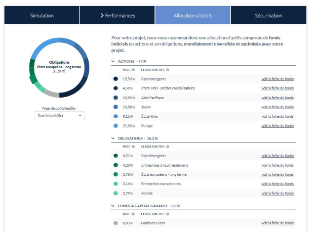 - Le robo-advisor dispose d’un simulateur qui permet de visualiser la composition de votre portefeuille boursier et l'évolution de votre capital. Ainsi, vous pouvez expérimenter les paramètres tels que l'acompte, le paiement programmé ou le choix du projet principal. Si la simulation est adéquate, le client peut choisir de valider cette allocation d'actifs via la procédure de souscription.