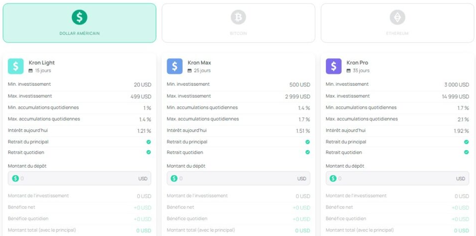 - Le Pack Kron Pro : ce pack est accessible avec un investissement minimum de 3000$ et jusqu’à 14 999$. Le rendement quotidien varie entre 1,7% et 2,1%. Vos fonds sont bloqués pour un délai de 35 jours avant de pouvoir être retirés.