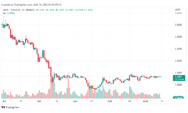 Le cours The Sandbox est actuellement à 1,33 $ avec une capitalisation boursière de 1 805 897 376 $, se classant ainsi 37e sur la liste des pièces les plus précieuses. Selon l’indice des prix TechNewsLeader, le volume de transactions de SAND sur 24 heures est de 345 317 983 $. Pourtant, le cours de Sandbox a chuté de -0,66 % en 24 heures. Le prix du SAND a augmenté de 1,89 % au cours des 7 derniers jours. Le volume de jetons en circulation est de 1 354 060 208 SAND.